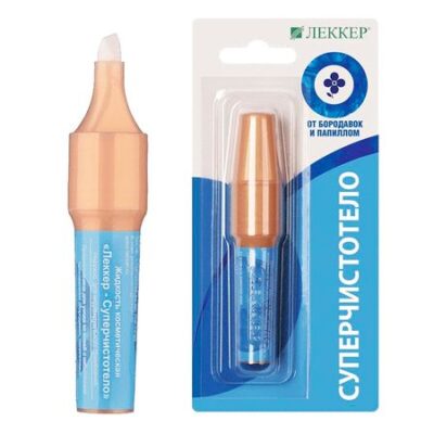 ЛЕККЕР-СУПЕРЧИСТОТЕЛОСредство от папиллом и бородавок «Суперчистотело», в состав которого входят экстракты чистотела, ромашки, календулы, череды, тысячелистника и акации. Лосьон позволяет быстро и эффективно удалить ороговевшие участи кожи и способствует отшелушиванию и удалению образований. Эффективность лосьона обусловлена наличием в составе натрия гидроокиси.Благодаря удобной форме выпуска идеально для домашнего использования. Форма маркера позволяет наносить лосьон точечно, не задевая здоровую кожу, исключая возможность получения химического ожога.