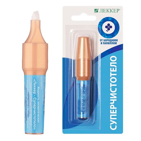 ЛЕККЕР-СУПЕРЧИСТОТЕЛОСредство от папиллом и бородавок «Суперчистотело», в состав которого входят экстракты чистотела, ромашки, календулы, череды, тысячелистника и акации. Лосьон позволяет быстро и эффективно удалить ороговевшие участи кожи и способствует отшелушиванию и удалению образований. Эффективность лосьона обусловлена наличием в составе натрия гидроокиси.Благодаря удобной форме выпуска идеально для домашнего использования. Форма маркера позволяет наносить лосьон точечно, не задевая здоровую кожу, исключая возможность получения химического ожога.