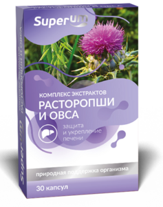 Печень и желчный пузырь активно участвуют в обмене веществ и пищеварении. Например, для утилизации жирных кислот необходима желчь, которая вырабатывается в желчном пузыре. Однако наиболее важная функция печени — детоксикационная. Печень обезвреживает вещества, попадающие в организм или образующиеся в нем в результате болезней или нарушения обмена веществ. От работы печени и желчного пузыря во многом зависит наше общее самочувствие, включая эмоциональное состояние и внешний вид. Поэтому так важно поддерживать работу этих органов и своевременно помогать им восстанавливаться после повышенных нагрузок. «Комплекс экстрактов расторопши и овса» предназначен для заботы о печени и нормализации ее работы. В состав препарата также входит лецитин.Экстракт расторопшиБлаготворное действие экстракта расторопши на состояние печени и работу желчного пузыря обусловлено активными веществами флаволигнанами. Экстракт расторопши улучшает клеточное дыхание, защищает стенки клеток печени от разрушения свободными радикалами и способствует превращению агрессивных токсинов, попадающих в печень, в менее вредные соединения. Флаволигнаны расторопши способствуют регенерации гепатоцитов (клеток печени) и скорейшей замене гибнущих клеток молодыми, уменьшают содержание жира в печени, оказывают детоксикационное действие. Также флаволигнаны расторопши обладают желчегонными свойствами, повышают секрецию желчных кислот.Экстракт овсаЭкстракт овса получают из зерен молочной спелости. Именно в такой стадии созревания все полезные вещества, которые содержатся в овсе, находятся в наиболее доступной для человеческого организма форме и легко усваиваются. Благодаря этому экстракт овса действует эффективнее, чем блюда из овсяной крупы. Экстракт овса полезен при интоксикации организма, так как способствует выведению из печени вредных веществ. Также экстракт овса улучшает процессы желчеобразования и желчевыведения, тем самым ускоряя разложение токсинов и удаление их из организма.