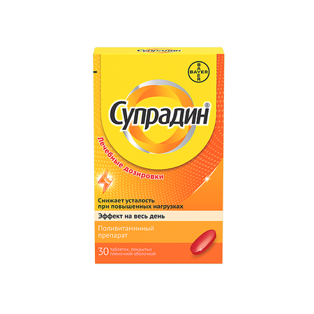 Показания Данные о фармакокинетике препарата не предоставлены. Фармакологическое действие Поливитамины с макро- и микроэлементами. Фармакологические свойства препарата определяются комплексом входящих в состав витаминов и минералов. Супрадин® содержит 12 витаминов в сочетании с минералами и редкими элементами, являющихся важными факторами метаболических процессов. Витамины необходимы для метаболизма углеводов, образования запасов энергии, метаболизма липидов, нуклеиновых кислот и белков, а также для синтеза коллагена, нейромедиаторов. Помимо участия в основных метаболических реакциях, витамины принимают участие в регуляции и координации метаболических процессов. Витамины необходимы для роста костей, заживления ран, поддержания нормального состояния сосудов, иммунного статуса, микросомального метаболизма лекарственных средств и детоксикации, для развития и дифференциации тканей. Витамин А способствует нормальному росту, участвует в формировании и поддержании структуры и функций костей, зубов, кожи, участвует в синтезе зрительного пигмента. Витамин В1 способствует нормальному функционированию нервной системы. Витамин В2 участвует в тканевом дыхании, белковом, углеводном и жировом обмене. Витамин В6 способствует поддержанию структуры и функции костей, зубов, десен, оказывает влияние на эритропоэз. Витамин B12 участвует в эритропоэзе, способствует нормальному функционированию нервной системы. Витамин С участвует в формировании и поддержании структуры и функции костей, зубов и десен; укрепляет стенки капилляров. Витамин D3 регулирует обмен фосфора и кальция в организме, содействуя всасыванию этих веществ из кишечника, своевременному отложению их в костях. Витамин Е обеспечивает нормальное функционирование эритроцитов, предохраняет от повреждения клеточные мембраны. Биотин принимает участие в обменных процессах, способствует усвоению белка. Пантотеновая кислота участвует в процессах метаболизма жиров, белков и углеводов. Фолиевая кислота участвует в эритропоэзе. Никотинамид принимает участие в окислительно-восстановительных процессах, обеспечивает перенос водорода и фосфата. Кальций участвует в формировании костей и зубов, способствует нормальной свертываемости крови. Магний участвует в формировании мышечной и костной тканей, а также принимает участие в синтезе белка. Железо участвует в эритропоэзе; является важной составной частью гемоглобина, который обеспечивает транспорт кислорода в ткани. Фосфор, наряду с кальцием, участвует в формировании костей и зубов, а также участвует в процессах энергетического обмена. Марганец содействует правильной минерализации костей. Медь необходима для нормальной функции эритроцитов и обмена железа. Цинк входит в состав около 70 ферментов, участвующих в синтезе и метаболизме гормонов (в основном глюкокортикостероидов), а также делении и взаимодействии иммунокомпетентных клеток. Молибден входит в состав ферментов и коферментов, участвующих во многих окислительно-восстановительных реакциях в организме. За исключением известных последствий острой недостаточности витаминов, растущий организм проявляет определенную потребность в витаминах, что позволяет предупреждать заболевания и поддерживать умственное и физическое состояние на высоком уровне. Недоста