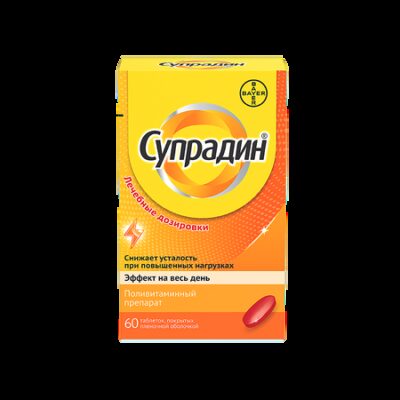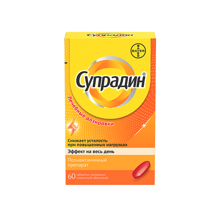 Показания Данные о фармакокинетике препарата не предоставлены. Фармакологическое действие Поливитамины с макро- и микроэлементами. Фармакологические свойства препарата определяются комплексом входящих в состав витаминов и минералов. Супрадин® содержит 12 витаминов в сочетании с минералами и редкими элементами, являющихся важными факторами метаболических процессов. Витамины необходимы для метаболизма углеводов, образования запасов энергии, метаболизма липидов, нуклеиновых кислот и белков, а также для синтеза коллагена, нейромедиаторов. Помимо участия в основных метаболических реакциях, витамины принимают участие в регуляции и координации метаболических процессов. Витамины необходимы для роста костей, заживления ран, поддержания нормального состояния сосудов, иммунного статуса, микросомального метаболизма лекарственных средств и детоксикации, для развития и дифференциации тканей. Витамин А способствует нормальному росту, участвует в формировании и поддержании структуры и функций костей, зубов, кожи, участвует в синтезе зрительного пигмента. Витамин В1 способствует нормальному функционированию нервной системы. Витамин В2 участвует в тканевом дыхании, белковом, углеводном и жировом обмене. Витамин В6 способствует поддержанию структуры и функции костей, зубов, десен, оказывает влияние на эритропоэз. Витамин B12 участвует в эритропоэзе, способствует нормальному функционированию нервной системы. Витамин С участвует в формировании и поддержании структуры и функции костей, зубов и десен; укрепляет стенки капилляров. Витамин D3 регулирует обмен фосфора и кальция в организме, содействуя всасыванию этих веществ из кишечника, своевременному отложению их в костях. Витамин Е обеспечивает нормальное функционирование эритроцитов, предохраняет от повреждения клеточные мембраны. Биотин принимает участие в обменных процессах, способствует усвоению белка. Пантотеновая кислота участвует в процессах метаболизма жиров, белков и углеводов. Фолиевая кислота участвует в эритропоэзе. Никотинамид принимает участие в окислительно-восстановительных процессах, обеспечивает перенос водорода и фосфата. Кальций участвует в формировании костей и зубов, способствует нормальной свертываемости крови. Магний участвует в формировании мышечной и костной тканей, а также принимает участие в синтезе белка. Железо участвует в эритропоэзе; является важной составной частью гемоглобина, который обеспечивает транспорт кислорода в ткани. Фосфор, наряду с кальцием, участвует в формировании костей и зубов, а также участвует в процессах энергетического обмена. Марганец содействует правильной минерализации костей. Медь необходима для нормальной функции эритроцитов и обмена железа. Цинк входит в состав около 70 ферментов, участвующих в синтезе и метаболизме гормонов (в основном глюкокортикостероидов), а также делении и взаимодействии иммунокомпетентных клеток. Молибден входит в состав ферментов и коферментов, участвующих во многих окислительно-восстановительных реакциях в организме. За исключением известных последствий острой недостаточности витаминов, растущий организм проявляет определенную потребность в витаминах, что позволяет предупреждать заболевания и поддерживать умственное и физическое состояние на высоком уровне. Недоста