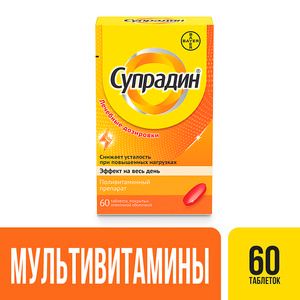 Главная » Аптека Супрадин Таблетки покрытые оболочкой 60 шт Просмотров 5 Овальные, двояковыпуклые таблетки, покрытые оболочкой, оранжево-красного цвета.Поливитаминное средство с минералами. Байер