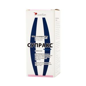 Показания к применениюИнфекционно-воспалительные заболевания, вызванные чувствительными к препарату микроорганизмами: Фарингит, тонзиллит, синусит.Острый и хронический бронхит.Средний отит.Неосложненные инфекции мочевыводящих путей.Неосложненная гонорея.Применение при беременности и кормлении грудьюПрименение Супракса при беременности возможно только в том случае, когда предполагаемая польза для матери превышает потенциальный риск для плода. При необходимости применения Супракса в период лактации следует прекратить грудное вскармливание.ПротивопоказанияНарушение функции почек с КК менее 60 мл/мин (для капсул).Детский возраст до 12 лет (для капсул).Детский возраст до 6 мес (для суспензии).Повышенная чувствительность к цефалоспоринам и пенициллинам.С осторожностью следует назначать препарат пациентам пожилого возраста, при хронической почечной недостаточности, псевдомембранозном колите (в анамнезе).Побочное действиеАллергические реакции крапивница, гиперемия кожи, кожный зуд, эозинофилия, лихорадка, многоформная экссудативная эритема (в т.ч. синдром Стивенса-Джонсона), токсический эпидермальный некролиз (синдром Лайелла), анафилактический шок, реакции, напоминающие сывороточную болезнь.Со стороны нервной системы головная боль, головокружение, шум в ушах, судороги.Со стороны пищеварительной системы сухость во рту, анорексия, тошнота, рвота, диарея, запор, метеоризм, боль в животе, дисбактериоз, нарушение функции печени, холестаз, холестатическая желтуха, кандидоз, стоматит, глоссит, псевдомембранозный энтероколит.Со стороны системы кроветворения панцитопения, лейкопения, нейтропения, агранулоцитоз, тромбоцитопения, гемолитическая анемия, апластическая анемия, кровотечение.Со стороны мочевыделительной системы интерстициальный нефрит, нарушение функции почек, острая почечная недостаточность.Со стороны половой системы вагинит, зуд половых органов.Со стороны лабораторных показателей увеличение активности печеночных трансаминаз и ЩФ, гипербилирубинемия, повышение азота мочевины, гиперкреатининемия, увеличение протромбинового времени.Прочие кандидомикоз, одышка.СоставВ 1 дозе содержится: цефиксима тригидрат (микронизированный) 1.402 г (100 мг/5 мл готовой суспензии) (эквивалентно 1.2 г цефиксима + 4% перезакладки) Вспомогательные вещества: натрия бензоат — 0.03 г, сахароза — 30.225 г, камедь ксантановая — 0.155 г, ароматизатор клубничный — 0.048 г.