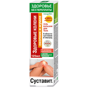 Окопник (живокост) способствует восстановлению поврежденных костных тканей. Стимулирует регенерацию костной и хрящевой ткани при заболеваниях суставов, улучшает качество синовиальной жидкости, заживляет суставные микротравмы.Мумие — один из самых мощных биостимуляторов, активизирует репаративные процессы, ускоряет восстановление костных и хрящевых тканей, замедляет процессы старения сустава, способствует уменьшению ломоты, возникающей при переменах погоды.Лопух обладает широким спектром действия, в том числе солевыводящим, противовоспалительным и противоотечным. Стимулирует обмен веществ и регенерацию тканей.
