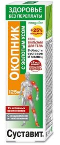 Суставит. Окопник с золотым усом Neogalen (Неогален) серии "Здоровье без переплаты" — эффективное средство на основе природных компонентов.Способствует нормализации функционального состояния. Обеспечивает структурными элементами для активного обновления и гибкости.Стимулирует естественную регенерацию тканей, препятствует развитию деструктивных процессов и старению.Действие и эффективность геля бальзама обеспечены высокой биологической активностью его натуральных компонентов, обладающих выраженным положительным комплексным действием.Активные компоненты:Окопник (живокост, Symphytum) применяется в лечебной практике около 2 тысяч лет. О свойствах окопника говорит его родовое название: Symphytum от греческого “symphytos” сращивать, соединять, и Consolida от латинского “consolidare” скреплять. Стимулирует регенерацию костной и хрящевой ткани, улучшает качество синовиальной жидкости, заживляет суставные микротравмы, ускоряет сращивание костей при переломах. Аллантоин, главное действующее вещество окопника, включён в список препаратов ВОЗ.Золотой ус (Callisia Fragronce) одно из самых сильных лекарственных растений, мощный биогенный стимулятор с широким спектром лечебного действия. В листьях и усах обнаружены дубильные вещества, флавоноиды, кислоты, большое содержание кальция и других микро и макроэлементов. Используется при множестве заболеваний; особенно эффективен в качестве профилактического средства и в комплексном лечении болезней суставов и позвоночника. Обладает выраженным обезболивающим, противовоспалительным, противомикробным, антисептическим, иммунорегулирующим, восстанавливающим действием, благотворно влияет на систему кровообращения. Высокая эффективность растения принесла ему заслуженную любовь и доверие народа.Хондроитин (Chondroitin) основной структурный компонент хряща и естественный защитник (хондропротектор) его клеток. Вырабатывается хрящевой тканью суставов. Повышает влагоемкость хряща, предотвращает его высыхание. Обеспечивает механические и эластические свойства суставных поверхностей, улучшает качество суставной смазки (синовиальной жидкости).Глюкозамин (Glucosamin) неотъемлемый элемент хрящевой ткани. Обеспечивает выработку хондроитина, улучшает обменные процессы в суставах. Стимулирует производство глюкозаминоглюканов, необходимых для восстановления хряща. Способствует регенерации поврежденного хряща при воспалительных и деструктивных процессах. Снижает болевые ощущения.Коллаген (Collagen) фибриллярный белок, составляющий основу соединительной ткани организма обеспечивающий ее прочность и эластичность. Способствует быстрому восстановлению и укреплению тканей. Нарушение синтеза коллагена приводит к повреждению связочного аппарата и хрящей.Лопух, эвкалипт, девясил, зверобой обладают выраженным болеутоляющим, противовоспалительным, противоотечным и антисептическим действием. Стимулируют обмен веществ и регенерацию суставных тканей.Гвоздичное дерево (Caryophyllus агоmaticus) вечнозеленое тропическое растение из семейства миртовых. Эфирное масло получают из бутонов методом воднопаровой дистилляции. Обладает противовоспалительными и обезболивающими свойствами. Основной компонент эвгенол оказывает выраженное антисептическое действие.