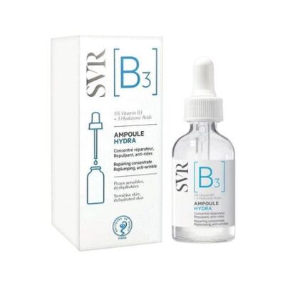 Бренд SVR (СВР) — Каждая линия косметики СВР разработана специально для решения конкретной дерматологической проблемы. Ее назначают своим пациентам косметологи и дерматологи в 45 странах мира. SVR AMPOULE (B3) HYDRA КОНЦЕНТРИРОВАННАЯ СЫВОРОТКА-УХОД ЗА КОЖЕЙ ЛИЦА — Прозрачный флюид. Ампула [B3] Гидра — сыворотка с высокой концентрацией витамина В3 успокаивает и повышает упругость кожи. В сочетание с тремя видами гиалуроновой кислоты (средней, высокой и очень высокой) интенсивно увлажняет кожу и удерживает влагу в слоях эпидермисе. Моментально уменьшается чувство стянутости и дискомфорта кожи. День за днем упругость кожи повышается, морщины разглаживаются, признаки старения уменьшаются. Эффективность заметна уже через 7 дней применения. Витамин В3, также его называют Ниацинамид, является основным мультикорретирующим активным компонентом, который укрепляет и восстанавливает кожный барьер. Ведущий активный компонент сыворотки, Витамин В3, стимулирует выработку липидов и белка кожного барьера для ограничения потери воды в слоях эпидермиса, уменьшает покраснения и раздражения, обладает антиоксидантным действием, повышает выработку коллагена. Клинически доказанная эффективность. Протестировано под дерматологическим контролем. Сыворотка содержит 91% компонентов натурального происхождения, защищенных в перерабатываемом стеклянном флаконе. Специальные особенности: Некомедогенно. Результат: Восстанавливающий концентрат для повышения упругости кожи и коррекции морщин.
