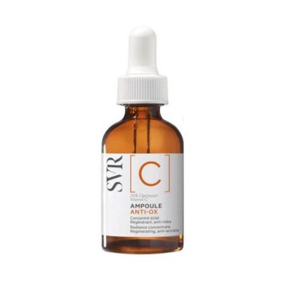 Бренд SVR (СВР) — Каждая линия косметики СВР разработана специально для решения конкретной дерматологической проблемы. Ее назначают своим пациентам косметологи и дерматологи в 45 странах мира. SVR AMPOULE (C) ANTI-OX КОНЦЕНТРИРОВАННАЯ СЫВОРОТКА-УХОД ЗА КОЖЕЙ ЛИЦА — Полупрозрачный флюид с цветочно-цитрусовой отдушкой. Ультра концентрированная сыворотка с оптимизированным витамином С придает сияние коже, снимает признаки усталости и разглаживает морщины. Витамин С — мощный антиоксидант, замедляющий процесс старения и придающий сияние коже. Как мощный антиоксидант, Витамин С способствует естественной выработки коллагена кожи. День за днем кожа в отличной форме: тонус, сияние и комфорт. При ежедневном использовании тонус кожи увеличивается, а признаки старения уменьшаются. Эффективность заметна через 7 дней применения. Витамин С способствует осветлению кожи, помогает сократить пигментацию и нейтрализует действие свободных радикалов (УФ-лучи, стресс, курение, загрязнение и т. д.) Ампулу С Антиоксидант Лаборатории SVR можно использовать 9 месяцев после ее вскрытия. Клинически доказанная эффективность. Протестировано под дерматологическим контролем. Лаборатория SVR выбрала оптимизированную формула витамина С для своей продукции. 20% оптимизированного Витамина С эквивалентно 17% чистого Витамина. Его структура аналогична чистой форме витамина и обладает теми же свойствами, но стабильна и эффективна с течением времени. Специальные особенности: Некомедогенно. Результат: Восстанавливающий концентрат для сияния кожи и коррекции морщин.
