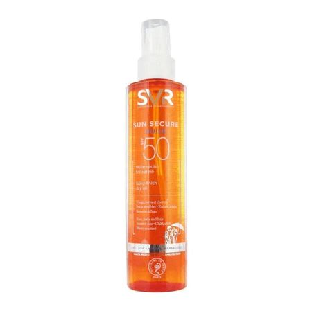Бренд SVR (СВР) — Каждая линия косметики СВР разработана специально для решения конкретной дерматологической проблемы. Ее назначают своим пациентам косметологи и дерматологи в 45 странах мира. SVR SUN SECURE МАСЛО СУХОЕ SPF50 — Прозрачный лосьон желтого цвета. Возраст: можно детям от 3-х лет SUN SECURE Сухое масло SPF50 обеспечивает очень высокую дерматологическую защиту от УФ-лучей (UVB + UVA + видимый свет + инфракрасные лучи). Шелковистое масло растительного происхождения (кокосовое масло) для сияющего и ровного загара. Разработано для лица и тела с чувствительной кожи, также может наноситься на волосы. Его уникальная нелипкая маслянистая текстура предотвращает сухость кожи, увлажняет ее и защищает волосы от солнечных лучей. Приятная гипоаллергенная отдушка. Не обладает фотосенсибилизирующим действием. Активные компоненты: Integral Secure Technology : UVB + UVA + видимый свет + инфракрасные лучи тройного действия, направленное на 100% УФ-лучей: — физическая защита на поверхности — биологическое действие на уровне клеток — восстановление ДНК и профилактика рака ?-КАРОТИН КОМПЛЕКС (антиоксиданты + витамины + липосомальный комплекс) обеспечивает: — защиту от окислительного повреждения, вызванного UVB + UVA + видимым светом + инфракрасными лучами) — глубокое проникновение и освобождение активных компонентов. Пролонгированное действие на свободные радикалы: до, во время и после экспозиции. Дерматологический контроль. Лицо, тело, волосы. Специальные особенности: Гипоаллергенно. Не содержит парабенов, минерального масла, спирта, октокрилена, пропиленгликоля, фотосенсибилизаторов. Некомедогенно. Результат: Очень высокая дерматологическая защита от УФ-лучей.
