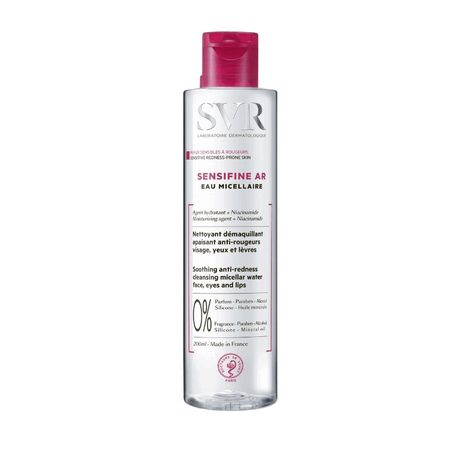 Суперделикатная формула мицеллярной воды SVR Sensifine AR Eau Micellaire не вызывает раздражения и аллергии, сохраняет гидролипидную мантию и физиологический уровень рН эпидермиса. Одно движение ватного диска – и с кожи удаляется даже водостойкая косметика. SVR Сенсифин AR Мицеллярная вода не требует смывания: вы без проблем можете очистить и освежить лицо во время поездки, прогулки и т.д. После ее применения исчезает краснота и чувство стянутости, уходит зуд. Кожа становится эластичной, бархатистой и сияющей. Активные компоненты: мицеллы жирных к-т поглощают загрязнения, частички косметики и излишки себума, легко удаляются с кожи ватным диском; ниацинамид успокаивает раздражение и воспаление, активизирует микроциркуляцию, стимулирует синтез коллагена и липидов, выравнивает цвет лица, снижает реактивность кожи, укрепляет стенки капилляров, борется со свободными радикалами; лимонная к-та проявляет дезинфицирующие и увлажняющие свойства, открывает поры, разглаживает и осветляет кожу, восстанавливает здоровое сияние эпидермиса. Без спирта Без консервантов без минеральных масел без отдушек без парабенов без силикона гипоаллергенно