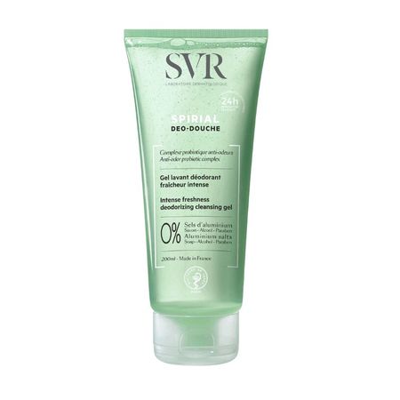 SVR Спириал Моющий гель-дезодорант — очищающий дезодорирующий гель для кожи лица, тела, волос и для интимной гигиены. Защищает от неприятного запаха на 24 часа Усиливает активность дезодорантов Гель отлично пенится, легко смывается и гарантирует длительное ощущение чистоты и свежести. Лёгкий аромат с цитрусовыми нотами прекрасно подходит как для женщин, так и для мужчин. При выборе дезодоранта ищите информацию в статье. Не содержит солей алюминия, щелочи, спирта, парабенов. Протестировано под дерматологическим и гинекологическим контролем.Активные компоненты: Пробиотический комплекс — продолжительное время защищает от образования неприятного запаха; Мягкая моющая основа обеспечивает деликатную и бережную гигиену, не сушит кожу, не раздражает чувствительные слизистые, придает ощущение свежести.