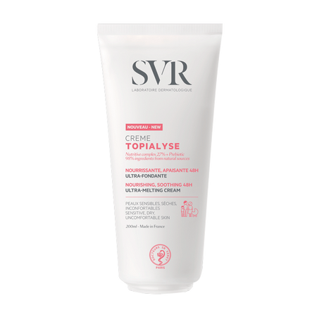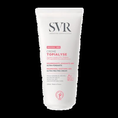 SVR Топиализ Питательный крем разработан для ухода за сухой раздражённой кожей с тенденцией к атопии. Предназначен для ежедневного применения для новорождённых, детей и взрослых, для лица и тела. Успокаивает кожу и уменьшает зуд Смягчает, питает и увлажняет Усиливает естественную защиту кожи Нежная, лёгкая нелипкая текстура быстро впитывается, даря ощущение комфорта. Гипоаллергенно. Не содержит парабенов, феноксиэтанола, минерального масла, красителей и спирта. Протестировано под контролем дерматологов и педиаторов.Активные компоненты: 27% увлажняющих и питательных активных веществ: успокаивает и смягчает, восстанавливает кожный барьер; Хлопковое масло и кокосовое масло, источники омег 3, 6 и 9: питательные, интенсивно восстанавливающие кожу; Масло Бабассу: питательное и успокаивающее, впитывается в кожу, делая нанесение легким и комфортным; Гидрофильные сахара: укрепляют кожный барьер и удерживают воду в коже для длительного комфорта и увлажнения; Ниацинамид 2 %: устраняет стянутость, увлажняет и восстанавливает кожный барьер.