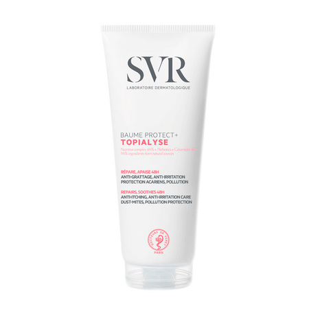 SVR Топиализ Бальзам Протект+ — релепидирующий уход для чувствительной сухой и атопичной кожи лица и тела. Подходит для новорождённых, детей и взрослых. Мгновенно успокаивает кожу Интенсивно питает кожу Оказывает противозудное действие 48 часов Обеспечивает длительное антирецидивное действие Бальзам с насыщенной текстурой, легко наносится на кожу и быстро впитывается, даря комфорт с первого нанесения. 98% натуральных ингредиентов. Гипоаллергенно. Не содержит отдушек, парабенов, силиконов. Протестировано под контролем дерматологов.Активные компоненты SVR Топиализ Бальзама Протект+: насыщенная питательная фаза из 46% растительных масел (10% кокосовое масло + 20,3% масло подсолнуха + масло бабассу + касторовое масло) — источник Омега 3,6,9 — оказывает моментальное успокаивающее действие, питает, смягчает; сахар-пребиотик восстанавливает баланс микрофлоры; церамиды AD патент уменьшает воздействие пылевого клеща на состояние кожного барьера и сокращает раздражения, связанные с проникновением аллергена.