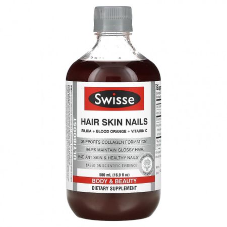 † Суточная норма не определена. Ultiboost® Диоксид кремния + красный апельсин + витамин C Поддержка выработки коллагена Помогает сохранить блеск волос и сияние кожи & Здоровые ногти На основе научных данных Средство премиального качества Укрепление и красота Пищевая добавка Преимущества. Swisse Ultiboost Hair Skin Nails — это превосходная косметическая формула с превосходным вкусом, которая способствует образованию коллагена и помогает поддерживать блеск волос, сияние кожи и здоровье ногтей. Выработка коллагена. Диоксид кремния и витамин С играют важную роль в образовании коллагена. Коллаген — это основной структурный белок, необходимый для поддержания здоровья и эластичности кожи. Коллаген поддерживает здоровую и крепкую соединительную ткань, помогая сохранить целостность и внешний вид кожи. Блестящие волосы, сияющая кожа и здоровые ногти. Эта формула с великолепным вкусом содержит диоксид кремния и витамин С, которые помогают поддерживать здоровье волос, кожи и ногтей. Антиоксидантная поддержка: Экстракт сицилийского красного апельсина и витамин С обеспечивают антиоксидантную поддержку, помогая защитить клетки от потенциального повреждения свободными радикалами. Жидкость Swisse Ultiboost Hair Skin Nails была разработана на основе научных данных и содержит необходимые питательные вещества, действующие изнутри.