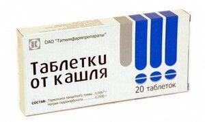 Главная » Аптека Таблетки от кашля 20 шт Просмотров 4 Таблетки от кашля — препарат на основе сырья растительного происхождения с противокашлевым и отхаркивающим дейтсвием. Татхимфармпрепараты