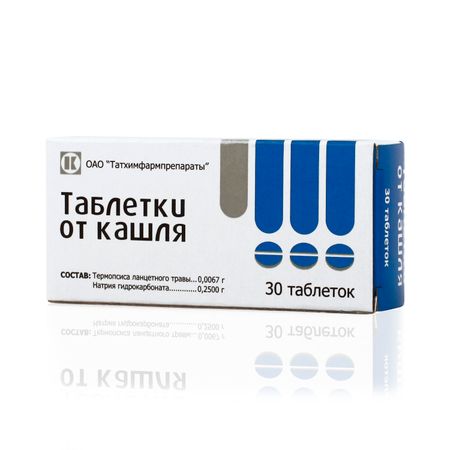 Показания Компоненты препарата хорошо всасываются в желудочно-кишечном тракте. Максимум действия наступает через 30-60 мин после приема внутрь и длится в течение 2-6 ч. Выводятся из организма почками, слизистой оболочкой дыхательных путей и бронхиальными железами. Фармакологическое действие Трава термопсиса обладает отхаркивающим действием, оказывая умеренное раздражающее действие на рецепторы слизистой оболочки желудка, рефлекторно повышает секрецию бронхиальных желез. Содержащиеся в траве термопсиса алкалоиды (цитизин, метилцитизин, пахикарпин, анагирин, термопсис, термопсидин) оказывают возбуждающее действие на дыхательный и, в высоких дозах, на рвотный центры. Натрия гидрокарбонат стимулирует секрецию бронхиальных желез, способствует снижению вязкости мокроты. Лекарственное взаимодействие Адсорбенты, вяжущие и обволакивающие средства могут уменьшить всасывание алкалоидов, входящих в состав травы термопсиса, в желудочно-кишечном тракте. Таблетки от кашля не следует применять одновременно с препаратами, содержащими кодеин и другие противокашлевые лекарственные средства, так как это затрудняет откашливание мокроты.