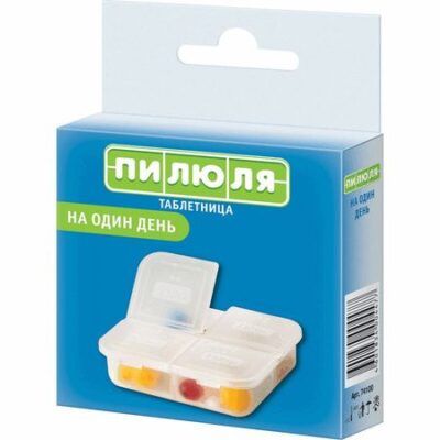 ТАБЛЕТНИЦА ПИЛЮЛЯ НА ОДИН ДЕНЬ ДЛЯ ЛЕКАРСТВЕННЫХ СРЕДСТВ — предназначена для компактного и упорядоченного хранения лекарственных средств или витаминов. Состоит из 4-х отделений для распределения лекарств или витаминов в соответствии с суточным режимом приема: утро, день, вечер, ночь. ХАРАКТЕРИСТИКИ Размер таблетницы без упаковки (Д:Ш:Г): 60х60х16 мм Количество отделений: 4 Символы Брайля: да Вес: 25 гр. Таблетница изготовлена из безопасного, легко моющегося пластика. Лучший выбор на каждый день!