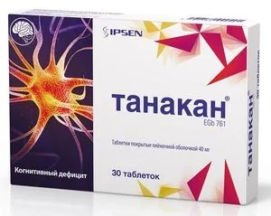 Показания к применениюКогнитивный и нейросенсорный дефицит различного генеза (за исключением болезни Альцгеймера и деменции различной этиологии).Перемежающаяся хромота при хронических облитерирующих артериопатиях нижних конечностей (II степень по Фонтейну).Нарушения зрения сосудистого генеза, снижение его остроты.Нарушения слуха, звон в ушах, головокружение и расстройства координации преимущественноСосудистого генеза.Болезнь и синдром Рейно.Применение при беременности и кормлении грудьюПрименение препарата Танакан противопоказано при беременности и в период лактации (грудного вскармливания) в связи с отсутствием клинических данных по применению препарата в данной группе пациентов.ПротивопоказанияПовышенная чувствительность к любому из компонентов препарата. Беременность и период лактации (грудного вскармливания).Побочное действиеСо стороны ЦНС головная боль, головокружение, бессонница.Со стороны пищеварительной системы диспепсия.Аллергические реакции кожная сыпь.Состав1 таблетка содержит:экстракт листьев гинкго двулопастного (EGb 761;) 40 мг, в т.ч. флавонолгликозидов 22-26.4%, гинкголиды-билобалиды 5.4-6.6%Вспомогательные вещества: лактозы моногидрат — 82.5 мг, целлюлоза микрокристаллическая — 50 мг, крахмал кукурузный — 37 мг, кремния диоксид коллоидный — 28 мг, тальк — 11.25 мг, магния стеарат — 1.25 мг.Состав оболочки: гипромеллоза (E464) — 6 мг, макрогол 400 — 1.5 мг, макрогол 6000 — 1.5 мг, титана диоксид (E171) — 1 мг, железа оксид красный (E172) — 0.7 мг.