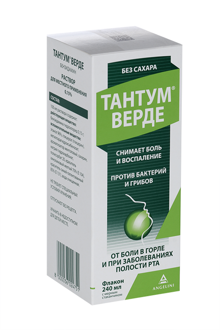 Главная » Аптека Тантум верде 0.15%, 240 мл, раствор для местного применения Просмотров 12 Анжелини Франческо СпА/Азиенде Кимике Риуните Анжелини Франческо АКРАФ СпА