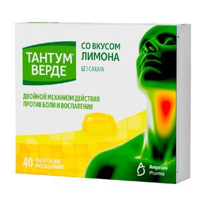 Показания к применениюгингивит, глоссит, стоматит (в т.ч. после лучевой и химиотерапии); фарингит, ларингит, тонзиллит; кандидоз слизистой оболочки полости рта (в составе комбинированной терапии); калькулезное воспаление слюнных желез; после оперативных вмешательств и травм (тонзиллэктомия, переломы челюсти); после лечения и удаления зубов; пародонтоз.Применение при беременности и кормлении грудьюПрепарат Тантум® Верде не следует применять при беременности и в период грудного вскармливания.Противопоказаниянепереносимость фруктозы; детский возраст до 6 лет; повышенная чувствительность к бензидамину или другим компонентам препарата.ИМЕЮТСЯ ПРОТИВОПОКАЗАНИЯ. ПЕРЕД УПОТРЕБЛЕНИЕМ НЕОБХОДИМО ОЗНАКОМИТЬСЯ С ИНСТРУКЦИЕЙПобочное действиеКлассификация частоты развития побочных эффектов ВОЗ: очень часто (≥1/10); часто (от ≥1/100 до <1/10); нечасто (от ≥1/1000 до <1/100); редко (от ≥1/10 000 до <1/1000); очень редко (<1/10 000); частота неизвестна (не может быть оценена на основании имеющихся данных). В каждой группе нежелательные эффекты представлены в порядке уменьшения их серьезности. Местные реакции: редко — сухость во рту, жжение в ротовой полости; частота неизвестна — чувство онемения в ротовой полости. Аллергические реакции: нечасто – фотосенсибилизация; редко — реакции гиперчувствительности, кожная сыпь, кожный зуд; очень редко — ангионевротический отек, ларингоспазм; частота неизвестна — анафилактические реакции. Если любые из указанных в инструкции побочных эффектов усугубляются или отмечаются любые другие побочные эффекты, не указанные в инструкции, пациенту следует немедленно сообщить об этом врачу.Составбензидамина гидрохлорид 3 мг Вспомогательные вещества: изомальтоза — 3073.53 мг, лимонной кислоты моногидрат — 44.82 мг, ацесульфам калия — 1.28 мг, ароматизаторы, левоментол — 1.707 мг, красители.Взаимодействие с другими препаратамиИсследования взаимодействия с другими лекарственными препаратами не проводились.