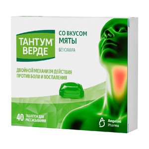 Показания к применениюгингивит, глоссит, стоматит (в т.ч. после лучевой и химиотерапии); фарингит, ларингит, тонзиллит; кандидоз слизистой оболочки полости рта (в составе комбинированной терапии); калькулезное воспаление слюнных желез; после оперативных вмешательств и травм (тонзиллэктомия, переломы челюсти); после лечения и удаления зубов; пародонтоз.Применение при беременности и кормлении грудьюПрепарат Тантум® Верде не следует применять при беременности и в период грудного вскармливания.Противопоказаниянепереносимость фруктозы; детский возраст до 6 лет; повышенная чувствительность к бензидамину или другим компонентам препарата.ИМЕЮТСЯ ПРОТИВОПОКАЗАНИЯ. ПЕРЕД УПОТРЕБЛЕНИЕМ НЕОБХОДИМО ОЗНАКОМИТЬСЯ С ИНСТРУКЦИЕЙПобочное действиеКлассификация частоты развития побочных эффектов ВОЗ: очень часто (≥1/10); часто (от ≥1/100 до <1/10); нечасто (от ≥1/1000 до <1/100); редко (от ≥1/10 000 до <1/1000); очень редко (<1/10 000); частота неизвестна (не может быть оценена на основании имеющихся данных). В каждой группе нежелательные эффекты представлены в порядке уменьшения их серьезности. Местные реакции: редко — сухость во рту, жжение в ротовой полости; частота неизвестна — чувство онемения в ротовой полости. Аллергические реакции: нечасто – фотосенсибилизация; редко — реакции гиперчувствительности, кожная сыпь, кожный зуд; очень редко — ангионевротический отек, ларингоспазм; частота неизвестна — анафилактические реакции. Если любые из указанных в инструкции побочных эффектов усугубляются или отмечаются любые другие побочные эффекты, не указанные в инструкции, пациенту следует немедленно сообщить об этом врачу.Составбензидамина гидрохлорид 3 мг Вспомогательные вещества: изомальтоза — 3073.53 мг, лимонной кислоты моногидрат — 44.82 мг, ацесульфам калия — 1.28 мг, ароматизаторы, левоментол — 1.707 мг, красители.Взаимодействие с другими препаратамиИсследования взаимодействия с другими лекарственными препаратами не проводились.