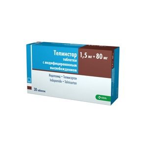 Телинстар, 1,5 мг + 80 мг, таблетки с модифицированным высвобождением Капсуловидные двояковыпуклые двухслойные таблетки. Один слой коричневато-желтого цвета с вкраплениями. Другой слой от белого до коричневато-желтовато-белого цвета с вкраплениями с выдавленной надписью TI2.Характеристика препарата:Препарат Телинстар — комбинированный препарат, который содержит два действующих вещества: индапамид и телмисартан. Препарат Телинстар относится к препаратам, действующим на ренин-ангиотензиновую систему, антагонистам рецепторов ангиотензина II в комбинации с диуретиками. Оба действующих вещества помогают снижать высокое артериальное давление.Препарат Телинстар используется в тех случаях, когда артериальное давление недостаточно снижается при приеме только одного действующего вещества, и поэтому требуется прием двух действующих веществ (комбинированное лечение) — индапамида и телмисартана. В этом случае будет удобно принимать не два препарата по отдельности, а только один препарат.