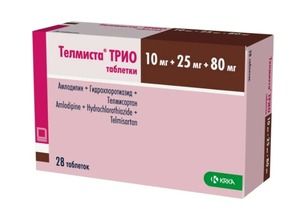Телмиста Трио, 10 мг+ 25 мг + 80 мг, таблетки Овальные двояковыпуклые двухслойные таблетки. Один слой белого или почти белого цвета с маркировкой L4. Другой слой коричневато-желтого цвета с вкраплениями.