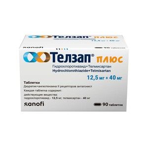 Показания к применениюПрепарат Телзап® Плюс применяется у взрослых с 18 лет для лечения артериальной гипертензии (при отсутствии эффективности монотерапии телмисартаном или гидрохлоротиазидом).ПротивопоказанияНе принимайте препарат Телзап® Плюс, если:• у Вас аллергия на телмисартан, гидрохлоротиазид или любые другие компоненты препарата (перечисленные в разделе 6 листка-вкладыша);• Вы беременны;• Вы кормите грудью;• у Вас серьёзные проблемы с выделением желчи из печени или желчного пузыря (обструктивные заболевания желчевыводящих путей);• у Вас тяжёлые заболевания печени;• у Вас тяжёлые заболевания почек;Страница 3 из 15• у Вас сахарный диабет или нарушение функции почек, и Вы принимаете препарат для снижения повышенного артериального давления, содержащий алискирен;• у Вас сахарный диабет и нарушение функции почек (диабетическая нефропатия), и Вы принимаете препарат для снижения повышенного артериального давления, содержащий ингибитор ангиотензинпревращающего фермента (ингибиторы АПФ);• у Вас выявлены: низкое содержание калия (гипокалиемия), низкое содержание натрия (гипонатриемия) или высокое содержание кальция, которые не могут быть устранены с помощью лечения..СоставПрепарат Телзап® Плюс содержитДействующими веществами являются гидрохлоротиазид и телмисартан.В каждой таблетке содержится 12,5 мг гидрохлоротиазида и 40 мг телмисартана.Прочими ингредиентами (вспомогательными веществами) являются: сорбитол, натрия гидроксид, повидон 25, магния стеарат.