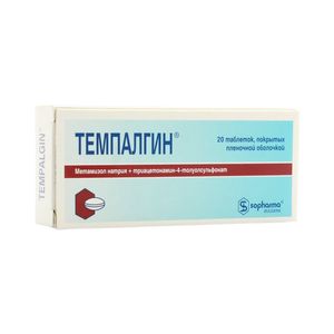 Показания к применениюТемпалгин — анальгетик-антипиретик комбинированного состава.Оказывает анальгезирующее, жаропонижающее, слабо выраженное противовоспалительное и седативное действие.В состав препарата входят неопиоидный анальгетик метамизол натрий и анксиолитик (транквилизатор) темпидон.Применение при беременности и кормлении грудьюСимптомы: тошнота, рвота, боли в эпигастрии, олигурия, тахикардия, снижение АД, одышка, шум в ушах, сонливость, нарушение сознания, судороги.Лечение: промывание желудка, назначение солевых слабительных и активированного угля ; в тяжелых случаях — гемодиализ, форсированный диурез, симптоматическая терапия, при развитии судорожного синдрома — в/в введение диазепама и быстродействующих барбитуратов.ПротивопоказанияВнутрь, после еды, запивая водой.Доза зависит от выраженности боли и индивидуальной чувствительности к препарату.Взрослые: обычная доза — по 1 табл. 1–3 раза в день. Максимальная разовая доза не должна превышать 1 табл. Максимальная суточная доза составляет 4 табл.При стоматологических процедурах: по 1 табл. за 30 мин до вмешательства.Дети старше 15 лет: по 1 табл. в день. Максимальная суточная доза — 2 табл.Особые группы пациентовПациенты старше 65 лет. Обычно не требуется уменьшение дозы. У пациентов с возрастными нарушениями функций почек и печени лечение препаратом Темпалгин должно быть непродолжительным. Максимальная суточная доза — 2 табл.Нарушение функции печени. У пациентов с нарушением функции печени возможно увеличение T1/2 метаболитов метамизола натрия. У пациентов с умеренными или тяжелыми поражениями печени рекомендуется лечение 1/2 рекомендуемой дозы для взрослых (максимальная суточная доза — 2 табл.).Нарушение функции почек. Метамизол натрия и его метаболиты выводятся почками. У пациентов с поражением функции почек лечение препаратом Темпалгин следует проводить, используя 1/2 рекомендуемой дозы для взрослых (максимальная суточная доза — 2 табл.).Продолжительность леченияЛечение препаратом Темпалгин не должно длиться более 3–5 дней. Его применение более в длительный период времени или в более высоких дозах возможно только после консультации с врачом.Побочное действиеМеры предосторожностиСоставТаблетки, покрытые пленочной оболочкой, состав (1 табл.):активные вещества:метамизол натрия моногидрат — 500 мгтриацетонамин-4-толуолсульфонат — 20 мгвспомогательные вещества: крахмал пшеничный — 95 мг; МКЦ — 75 мг; повидон К25 — 45 мг; тальк — 15 мг; магния стеарат — 10 мгоболочка пленочная: Opadry II зеленый 85 F 21526 — 23 мг: поливиниловый спирт частично гидролизованный — 9,2 мг; макрогол 3350 — 4,646 мг; тальк — 3,404 мг; титана диоксид (Е171) — 4,37 мг; хинолиновый желтый (Е104) алюминиевый лак — 1,035 мг; бриллиантовый голубой (Е133) FCF алюминиевый лак — 0,345 мг