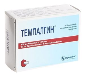 Показания к применению умеренно или слабо выраженный болевой синдром (в т.ч. головная боль, мигрень, зубная боль, невралгия, корешковый синдром, миалгия, артралгия, альгодисменорея), особенно у больных с повышенной нервной возбудимостью; слабо выраженные боли висцерального происхождения (в т.ч. почечная, печеночная, кишечная колика) в комбинации со спазмолитической терапией; болевой синдром после хирургических и диагностических вмешательств (в качестве вспомогательного средства); повышение температуры тела при простудных и других инфекционно-воспалительных заболеваниях. Применение при беременности и кормлении грудьюПрепарат противопоказан к применению при беременности. Не следует применять препарат в период лактации, т.к. оба компонента выделяются с грудным молоком.Противопоказания выраженная печеночная недостаточность; выраженная почечная недостаточность; хроническая сердечная недостаточность; артериальная гипотензия (снижение систолического уровня АД ниже 100 мм рт.ст.); угнетение кроветворения (гранулоцитопения, лейкопения, агранулоцитоз, цитостатическая или инфекционная нейтропения); дефицит глюкозо-6-фосфатдегидрогеназы; «аспириновая» астма; беременность; период лактации (грудное вскармливание); детский возраст (до 14 лет); повышенная чувствительность к метамизолу натрия, производным пиразолона или триацетонамин-4-толуенсульфонату. С осторожностью назначают: при заболеваниях почек (пиелонефрит, гломерулонефрит, в т.ч. в анамнезе); при печеночной/почечной недостаточности умеренной степени тяжести; при бронхиальной астме; при предрасположенности к развитию артериальной гипотензии; при длительном злоупотреблении алкоголем. Состав1 таб. Метамизол натрия 500 мг триацетонамин-4-толуенсульфонат (темпидон) 20 мг. Вспомогательные вещества: крахмал пшеничный, целлюлоза микрокристаллическая, тальк, магния стеарат, кросповидон (коллидон К 25), титана диоксид, полиэтиленгликоль 400, масло касторовое, глицерол, дибутилфталат, эудражит L ацетон 12.