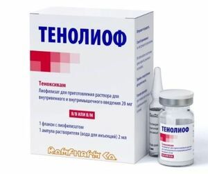 Показания к применению- ревматоидный артрит;- остеоартрит;- анкилозирующий спондилит;- суставной синдром при обострении течения подагры;- бурсит;- тендовагинит;- болевой синдром (слабой и средней интенсивности): артралгия, миалгия, невралгия, мигрень, зубная и головная боль, альгодисменорея;- боль при травмах, ожогах;Препарат предназначен для симптоматической терапии, уменьшения боли и воспаления на момент использования, на прогрессирование заболевания не влияет.Побочное действиеЧастота развития побочных эффектов классифицирована согласно реко-мендациям Всемирной организации здравоохранения: очень часто (>1/10); часто (от > /100, <1/10); нечасто (>1/1000, <1/100); редко (>1/10000, <1/1000); очень редко (<1/10000), не установлено.Со стороны пищеварительной системы:очень часто — диспепсия (тошнота, рвота, изжога, диарея, метеоризм), НПВП-гастропатия, абдоминальные боли, стоматит, анорексия, нарушение функции печени;редко — изъязвление слизистой оболочки желудочно-кишечного тракта (ЖКТ), кровотечение (желудочно-кишечное, маточное, геморроидальное), перфорация стенок кишечника.Со стороны сердечно-сосудистой системы:редко — сердечная недостаточность, тахикардия, повышение артериально-го давления.Со стороны центральной нервной системы:часто — головокружение, головная боль, сонливость, депрессия, возбужде-ние, снижение слуха, шум в ушах, раздражение глаз, нарушение зрения.Нарушения со стороны кожи и подкожной клетчатки:часто — кожный зуд, сыпь, крапивница и эритема;очень редко — фотодерматит, синдром Стивенса-Джонсона, синдром Лайелла.Нарушения со стороны мочевыделительной системы:часто — повышение содержания азота мочевины и креатинина в крови.Со стороны органов кроветворения:часто — агранулоцитоз, лейкопения,редко — анемия, тромбоцитопения, лейкопения, панцитопения.Нарушения со стороны гепатобилиарной системы:часто — повышение активности аланинаминотрансферазы (АЛТ), аспартат-аминотрансферазы (АСТ), гамма-глютамилтранспептидазы (гамма-ГТ) и уровня билирубина в сыворотке.Лабораторные показатели: гиперкреатининемия, гипербилирубинемия, повышение концентрации азота мочевины и активности «печеночных» транса-миназ, удлинение времени кровотечения.На фоне лечения могут наблюдаться психические нарушения и нарушение обмена веществ.Состав1 флакон препарата содержит:действующее вещество: теноксикам — 20,00 мг;вспомогательные вещества: маннитол — 66,00 мг, натрия дисульфит — 2,10 мг, динатрия эдетат — 0,22 мг, трометамол — 3,40 мг, 1 М раствор натрия гидроксида — до pH 9,8 ± 0,2.1 ампула растворителя содержит:вода для инъекций — 2,0 мл.