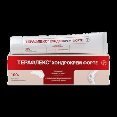 Показания Препарат рекомендуется к применению в составе комплексной терапии дегенеративно-дистрофических заболеваний опорно-двигательного аппарата: остеоартроза, остеохондроза позвоночника; иных заболеваний суставов, сопровождающихся болевым синдромом. Фармакологическое действие Терафлекс® Хондрокрем Форте обладает комбинированным действием: замедляет прогрессирование остеоартроза и остеохондроза, оказывает обезболивающее действие, способствует увеличению объема движения суставов (в области нанесения крема), обладает противовоспалительным действием, уменьшает припухлость суставов. Благодаря оптимальному сочетанию компонентов крема отмечается взаимное усиление их обезболивающего и противовоспалительного эффектов. Хондроитина сульфат — высокомолекулярный мукополисахарид, который является естественным компонентом хрящевой ткани. Хондроитина сульфат улучшает фосфорно-кальциевый обмен в хрящевой ткани, ингибирует ферменты, вызывающие поражение хрящевой ткани, тормозит процессы дегенерации (разрушения) хрящевой ткани, стимулирует синтез гликозаминогликанов, способствует регенерации (восстановлению) хрящевых поверхностей суставов, ускоряет процессы их репарации, препятствует коллапсу соединительной ткани. Это приводит к уменьшению болезненности и увеличению подвижности пораженных суставов. Мелоксикам — НПВС, обладает противовоспалительным, анальгетическим действием. Мелоксикам избирательно ингибирует ЦОГ-2, нарушает метаболизм арахидоновой кислоты, уменьшает в очаге воспаления количество простагландинов (медиаторов боли и воспаления). Мелоксикам является хондронейтральным препаратом, не оказывает негативного влияния на хрящевую ткань, не влияет на синтез протеогликана хондроцитами суставного хряща. Лекарственное взаимодействие Случаи взаимодействия или несовместимости с другими лекарственными средствами не описаны.