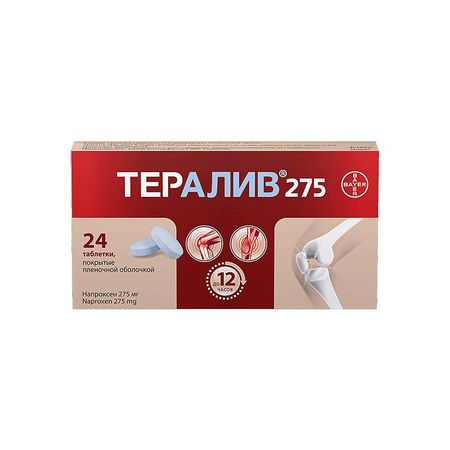 Показания Заболевания опорно-двигательного аппарата: ревматическое поражение мягких тканей; остеоартроз периферических суставов и позвоночника, в т.ч. с радикулярным синдромом; тендовагинит; бурсит. Болевой синдром слабой или умеренной степени выраженности: невралгия; оссалгия; миалгия; люмбоишиалгия; посттравматический болевой синдром (растяжения и ушибы), сопровождающийся воспалением; головная боль, мигрень; альгодисменорея; зубная боль. В составе комплексной терапии инфекционно-воспалительных заболеваний уха, горла, носа с выраженным болевым синдромом: фарингит; тонзиллит; отит. Лихорадочный синдром при «простудных» и инфекционных заболеваниях. Препарат Тералив 275 применяется для симптоматической терапии (для уменьшения боли, воспаления и снижения повышенной температуры тела) и на прогрессирование основного заболевания не влияет. Фармакологическое действие Препарат Тералив 275 представляет собой напроксен, обладает обезболивающим, жаропонижающим и противовоспалительным действием. Механизм действия связан с неселективным ингибированием активности циклооксигеназы-1 и -2 (ЦОГ-1, ЦОГ-2). Препарат Тералив 275, таблетки, покрытые пленочной оболочкой, хорошо растворяется, быстро всасывается из ЖКТ и обеспечивает быстрое наступление обезболивающего эффекта. Лекарственное взаимодействие При лечении антикоагулянтами следует иметь в виду, что напроксен может увеличивать время кровотечения. Не следует применять препарат Тералив 275 одновременно с ацетилсалициловой кислотой, другими НПВП, включая селективные ингибиторы ЦОГ-2 (возрастание риска развития побочных эффектов). Пациенты, одновременно получающие гидантоины, антикоагулянты или другие лекарственные препараты, связывающиеся в значительной степени с белками плазмы крови, должны следить за признаками потенцирования действия или передозировкой этих препаратов. Препарат Тералив 275 может снижать антигипертензивное действие пропранолола и других бета-адреноблокаторов, а также может увеличивать риск почечной недостаточности, связанной с применением ингибиторов АПФ. НПВП могут уменьшать мочегонное действие диуретиков. Под действием напроксена ингибируется натрийуретическое действие фуросемида. Диуретики могут повышать риск нефротоксичности НПВП. Ингибирование почечного клиренса лития приводит к увеличению концентрации лития в плазме крови. Прием пробенецида увеличивает концентрацию напроксена в плазме крови. Циклоспорин увеличивает риск развития почечной недостаточности. Напроксен замедляет экскрецию метотрексата, фенитоина, сульфаниламидов, увеличивая риск развития их токсического действия. Антацидные препараты, содержащие магний и алюминий, уменьшают абсорбцию напроксена. Миелотоксические лекарственные средства усиливают проявления гематоксичности препарата. По данным исследований in vitro одновременное применение напроксена и зидовудина увеличивает концентрацию зидовудина в плазме крови. Одновременное применение кортикостероидов может увеличивать риск образования язвы или кровотечения ЖКТ. НПВП могут усиливать действие антикоагулянтов, таких как варфарин. Одновременное применение напроксена и антитромбоцитарных препаратов, селективных ингибиторов обратного захвата серотонина повышает риск развития желудочно-кишечного кровотече