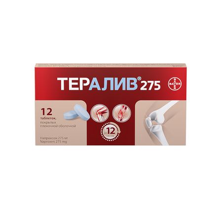 Показания Заболевания опорно-двигательного аппарата: ревматическое поражение мягких тканей; остеоартроз периферических суставов и позвоночника, в т.ч. с радикулярным синдромом; тендовагинит; бурсит. Болевой синдром слабой или умеренной степени выраженности: невралгия; оссалгия; миалгия; люмбоишиалгия; посттравматический болевой синдром (растяжения и ушибы), сопровождающийся воспалением; головная боль, мигрень; альгодисменорея; зубная боль. В составе комплексной терапии инфекционно-воспалительных заболеваний уха, горла, носа с выраженным болевым синдромом: фарингит; тонзиллит; отит. Лихорадочный синдром при «простудных» и инфекционных заболеваниях. Препарат Тералив 275 применяется для симптоматической терапии (для уменьшения боли, воспаления и снижения повышенной температуры тела) и на прогрессирование основного заболевания не влияет. Фармакологическое действие Препарат Тералив 275 представляет собой напроксен, обладает обезболивающим, жаропонижающим и противовоспалительным действием. Механизм действия связан с неселективным ингибированием активности циклооксигеназы-1 и -2 (ЦОГ-1, ЦОГ-2). Препарат Тералив 275, таблетки, покрытые пленочной оболочкой, хорошо растворяется, быстро всасывается из ЖКТ и обеспечивает быстрое наступление обезболивающего эффекта. Лекарственное взаимодействие При лечении антикоагулянтами следует иметь в виду, что напроксен может увеличивать время кровотечения. Не следует применять препарат Тералив 275 одновременно с ацетилсалициловой кислотой, другими НПВП, включая селективные ингибиторы ЦОГ-2 (возрастание риска развития побочных эффектов). Пациенты, одновременно получающие гидантоины, антикоагулянты или другие лекарственные препараты, связывающиеся в значительной степени с белками плазмы крови, должны следить за признаками потенцирования действия или передозировкой этих препаратов. Препарат Тералив 275 может снижать антигипертензивное действие пропранолола и других бета-адреноблокаторов, а также может увеличивать риск почечной недостаточности, связанной с применением ингибиторов АПФ. НПВП могут уменьшать мочегонное действие диуретиков. Под действием напроксена ингибируется натрийуретическое действие фуросемида. Диуретики могут повышать риск нефротоксичности НПВП. Ингибирование почечного клиренса лития приводит к увеличению концентрации лития в плазме крови. Прием пробенецида увеличивает концентрацию напроксена в плазме крови. Циклоспорин увеличивает риск развития почечной недостаточности. Напроксен замедляет экскрецию метотрексата, фенитоина, сульфаниламидов, увеличивая риск развития их токсического действия. Антацидные препараты, содержащие магний и алюминий, уменьшают абсорбцию напроксена. Миелотоксические лекарственные средства усиливают проявления гематоксичности препарата. По данным исследований in vitro одновременное применение напроксена и зидовудина увеличивает концентрацию зидовудина в плазме крови. Одновременное применение кортикостероидов может увеличивать риск образования язвы или кровотечения ЖКТ. НПВП могут усиливать действие антикоагулянтов, таких как варфарин. Одновременное применение напроксена и антитромбоцитарных препаратов, селективных ингибиторов обратного захвата серотонина повышает риск развития желудочно-кишечного кровотече