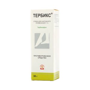 Показания к применениюДля приема внутрь: грибковые поражения кожи, вызванные дерматофитами, — трихофития, эпидермофития, микроспория, грибковые поражения ногтей (онихомикозы), кандидоз. Для наружного применения: грибковые поражения кожи, вызванные дерматофитами, кандидоз; разноцветный лишай.Применение при беременности и кормлении грудьюВ экспериментальных исследованиях тератогенных свойств тербинафина выявлено не было. До настоящего времени не сообщалось о каких-либо пороках развития при его применении. Однако, поскольку клинический опыт применения тербинафина у беременных женщин очень ограничен, его следует применять только по строгим показаниям. Тербинафин выделяется с грудным молоком, но в случае применения кормящей матерью спрея или крема Тербикс через кожу всасывается небольшое количество активного вещества, поэтому неблагоприятное воздействие на младенца маловероятно.ПротивопоказанияПовышенная чувствительность к тербинафину.Побочное действиеСо стороны пищеварительной системы: тошнота, анорексия, умеренные боли в животе, диарея, нарушения или потеря вкусовых ощущений, холестаз, желтуха, гепатит. Аллергические реакции: кожная сыпь; редко — артралгия, миалгия, многоформная эритема, синдром Стивенса-Джонсона. Со стороны ЦНС: головная боль. Со стороны системы кроветворения: нейтропения, тромбоцитопения. Местные реакции: гиперемия, зуд, ощущение жжения.Состав1 г спрея содержит:Активное вещество: тербинафина гидрохлорид 10 мг.Взаимодействие с другими препаратамиПрепараты, вызывающие индукцию микросомальных ферментов печени, увеличивают клиренс тербинафина; препараты, ингибирующие микросомальные ферменты печени — уменьшают клиренс тербинафина.