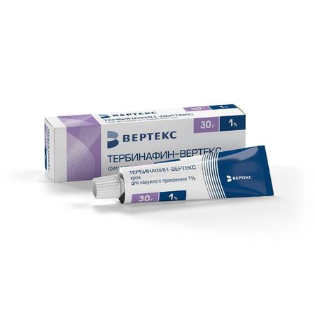 Показания профилактика и лечение грибковых инфекций кожи, в т.ч. микозов стоп, паховой эпидермофитии (tinea cruris), грибковых поражений гладкой кожи тела (tinea corporis), вызванных такими дерматофитами, как Trichophyton (в т.ч. Trichophyton rubrum, Trichophyton mentagrophytes, Trichophyton verrucosum, Trichophyton violaceum), Microsporum canis и Epidermophyton floccosum; дрожжевые инфекции кожи, в основном те, которые вызываются родом Candida (например, Candida albicans), в частности опрелость; разноцветный лишай (Pityriasis versicolor), вызываемый Pityrosporum orbiculare (также известный под названием Malassezia furfur). Фармакологическое действие Противогрибковый препарат для местного применения, обладающий широким спектром противогрибковой активности. Даже в небольших концентрациях тербинафин оказывает фунгицидное действие в отношении дерматофитов (Trichophyton rubrum, Trichophyton mentagrophytes, Trichophyton verrucosum, Trichophyton violaceum, Trichophyton tonsurans, Microsporum canis, Epidermophyton floccosum), плесневых (в основном Candida albicans) и определенных диморфных грибов (Pityrosporum orbiculare). Активность в отношении дрожжевых грибов, в зависимости от их вида, может быть фунгицидной или фунгистатической. Тербинафин специфическим образом изменяет ранний этап биосинтеза стеролов, происходящего в грибах. Это ведет к дефициту эргостерола и внутриклеточному накоплению сквалена, что вызывает гибель клетки гриба. Действие тербинафина осуществляется путем ингибирования фермента скваленэпоксидазы, расположенного на клеточной мембране гриба. Тербинафин не оказывает влияния на систему цитохрома Р450 у человека и, соответственно, на метаболизм гормонов или других лекарственных препаратов. Фармакокинетика При местном применении абсорбция — 5%, оказывает незначительное системное действие. Лекарственное взаимодействие Какое-либо лекарственное взаимодействие для тербинафина в форме крема неизвестно
