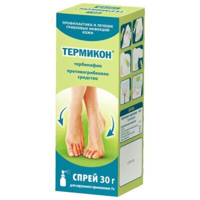 Показания профилактика и лечение грибковых инфекций кожи, в т.ч. микозов стоп, паховой эпидермофитии (tinea cruris), грибковых поражений гладкой кожи тела (tinea corporis), вызванных такими дерматофитами как Trichophyton rubrum, Trichophyton mentagrophytes, Trichophyton tonsurans, Trichophyton verrucosum, Trichophyton violaceum, Microsporum canis и Epidermophyton floccosum; разноцветный лишай, вызываемый Pityrosporum orbiculare (Malassezia furfur). Фармакологическое действие Противогрибковый препарат, аллиламин. Обладает широким спектром противогрибкового действия. Активен в отношении дерматофитов: Trichophyton rubrum, Trichophyton mentagrophytes, Trichophyton tonsurans, Trichophyton verrucosum, Trichophyton violaceum, Microsporum canis, Epidermophyton floccosum. В низких концентрациях оказывает фунгицидное действие на дерматофиты, плесневые грибы (в т.ч. Aspergillus, Cladosporium, Scopulariopsis brevicaulis) и некоторых диморфных грибов. На дрожжевые грибы рода Candida (главным образом Candida albicans) и их мицелиальные формы, в зависимости от вида, препарат оказывает фунгицидное или фунгистатическое действие. Термикон® нарушает ранний этап биосинтеза основного компонента клеточной мембраны гриба эргостерола путем ингибирования фермента скваленэпоксидазы. Это ведет к дефициту эргостерола и к внутриклеточному накоплению сквалена, что вызывает гибель клетки гриба. Действие тербинафина осуществляется путем ингибирования фермента скваленэпоксидазы, расположенного на клеточной мембране гриба. Лекарственное взаимодействие В настоящее время лекарственное взаимодействие Термикона неизвестно.
