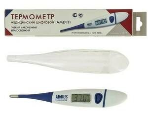 Термометр с гибким атравматическим наконечником и влагоустойчивым корпусом.Характеристики:Артикул AMDT-11Дисплей ЖК увеличенный дисплей, цена наименьшего разряда 0,1°С, Стекло специальной формы для удобства считывания показаний.Влагоустойчивый корпус естьУдаростойкий корпус естьГибкий наконечник естьПодсветка НетРазмер (ВхШхД) 12Х20Х127 ммКнопка включения ЕстьДиапазон измерения 32,0 до 42,0 °СИндикатор повышенной температуры НетЗвуковой сигнал после включения ~ 1 секундаЗвуковой сигнал по окончании измерения ~ 4 секунды после измеренияЗвуковой сигнал при повышенной t° ~ 4 секунды при t° выше 37,8°СТочность измерения и погрешность ±0,1 (35,0?39,0 °С)±0,2 ( 32,0?34,9, 39,1?42,0 °С)Память На 1 измерениеМасса 10,5 гПитание 1,5В (LR41, L736)Срок службы источника питания 1000 циклов измеренияФутляр Есть