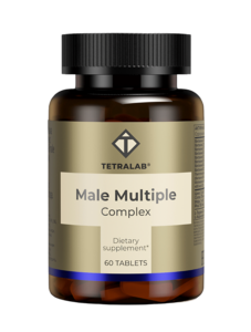 «Витаминный комплекс для мужчин» — мощный заряд витаминов и минералов для активной жизни современного мужчины!Быть мужчиной непросто, ведь если ты — «сильный пол», то на тебе огромная ответственность за себя и близких и ежедневное решение множества задач, без оправданий и скидок на обстоятельства. Как сохранить здоровье в бешеном ритме современной жизни. Правильное питание, соблюдение режима сна и отдыха, физические нагрузки — казалось бы, очевидные вещи, но именно они дают самый стойкий и гарантированный эффект. К сожалению, стресс, недосыпание, чрезмерное употребление алкоголя увеличивают расход и без того не бесконечных полезных ресурсов организма.Содержание в 1 таблетке в мгВитамин А (РЭ) 0,9 мг (±20 %)Витамин С 90 мг (±15 %)Витамин Е (ТЭ) 15 мг (±20 %)Витамин В1 1,5 мг (±20 %)Витамин В2 1,8 мг (±20 %)Витамин В3 (РР) 20 мг (±15 %)Витамин В6 2 мг (±20 %)Витамин В12 3 мкг (±20 %)Пантотеновая кислота (Витамин В5) 5 мг (±20 %)Фолиевая кислота (Витамин В9) 400 мкг (±20 %)Цинк 12 мг (±20 %)Селен 75 мкг (±20 %)Медь 1 мг (±20 %)Йод 150 мкг (±20 %)L-Таурин 120 мг (±15 %)L-Карнитин 90 мг (±15 %)Информация о биологически активных веществах и их свойствах:L-КарнитинСпособствует повышению физической и умственной работоспособности, а также повышению выносливости во время физических нагрузок и улучшению восстановления после них. Является ценным элементом для мужского здоровья, поскольку содержится в семенной жидкости. Употребление L-карнитина положительно сказывается на количестве сперматозоидов и их подвижности, способствуя улучшению качества спермы.L-ТауринАминокислота, которая способствует нейтрализации, связыванию и удалению из организма токсинов. Благодаря своим антиоксидантным свойствам помогает защищать ткани сердца от повреждения свободными радикалами, поддерживает здоровье глаз. Участвует в регуляции углеводного обмена и способствует снижению уровня сахара в крови.Аскорбиновая кислота (витамин С)Мощный антиоксидант, повышает сопротивляемость организма различным инфекциям, способствует повышению эластичности кровеносных сосудов. Витамин С ответственен как за синтез коллагена и восстановление (а значит, и рост) мышц, так и за усвоение минералов и поддержание здорового уровня тестостерона и других гормонов.Витамин ЕАнтиоксидант, способный стимулировать иммунную систему, способствует нормализации уровня холестерина в крови и поддержанию нормального состояния сердечно-сосудистой системы и репродуктивного здоровья.ЦинкСпособствует повышению концентрации и подвижности сперматозоидов, влияет на активность половых гормонов. Принимает участие в иммунном ответе, а также в процессах роста и дифференцировки клеток наружного слоя кожи.СеленПовышает сопротивляемость организма вирусам и бактериям. Благоприятно влияет на обменные процессы, способствует нормализации деятельности нервной и эндокринной систем, а также участвует в процессах образования и созревания сперматозоидов.Витамин В3 (витамин РР)Способствует улучшению кровообращения, ускорению обмена веществ, обладает сосудорасширяющим действием. Помогает нормализовать уровень холестерина.Витамин АЭффективный антиоксидант, положительно влияет на ускорение белкового обмена в хрящевой и костной ткани, повышение устойчивости организма к инфекциям. Способствует обеспечению хорошего зрения в условиях недостаточного или