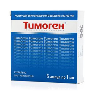 Показания к применению— комплексная терапия острых и хронических инфекционно-воспалительных заболеваний, сопровождающихся снижением показателей клеточного иммунитета;— профилактика угнетения иммунитета, кроветворения, процессов регенерации в посттравматическом и послеоперационном периоде, в процессе проведения лучевой терапии или химиотерапии, при использовании массивных доз антибиотиков;— профилактика и комплексная терапия вирусных (в т.ч. ОРЗ и грипп), бактериальных и хламидийных инфекций;— профилактика и комплексная терапия острых и хронических заболеваний дыхательных путей.Применение при беременности и кормлении грудьюВ целях безопасности, из-за недостаточного количества данных, назначение препарата при беременности и период грудного вскармливания возможно только, если предполагаемая польза для матери превышает потенциальный риск для плода или ребенка.Противопоказания— беременность;— период лактации (грудное вскармливание);— повышенная чувствительность к компонентам препарата.Побочное действиеВозможно: аллергические реакции.Состав1 мл раствора содержит:Активное вещество: альфа-глутамил-триптофан натрия (в пересчете на альфа-глутамил-триптофан) 100 мкгВспомогательные вещества: натрия хлорид — 9000 мкг, вода д/и — до 1 мл.Взаимодействие с другими препаратамиЛекарственное взаимодействие препарата Тимоген не выявлено.
