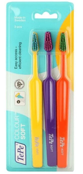 Набор из 3-х зубных щёток с мягкой щетиной TePe® Colour™ Soft для ежедневного ухода за зубной эмалью и дёснами.Colour™ — копия самой популярной модели Select™, отличающаяся цветной щетиной.Шведский дизайн.Удобная ручка и зауженная головка для эффективного очищения полости рта.Закруглённые на концах щетинки мягко очищают зубной налёт, не царапая поверхность эмали.Минимум деталей и яркий цвет.Регулируемый наклон головкиTePe® Colour™ можно отрегулировать так, чтобы она максимально соответствовала вашей анатомии.Опустите головку щётки (до ручки) в очень горячую воду на 1-2 минуты.Достаньте и аккуратно наклоните головку под удобным для вас углом.Опустите щётку в очень холодную воду на 2-3 минуты.Подходит для взрослых и детей подросткового возраста.