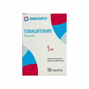 Тофацитиниб, 5 мг, таблетки, покрытые пленочной оболочкой Круглые двояковыпуклые таблетки, покрытые пленочной оболочкой белого цвета. На изломе — ядро белого или почти белого цвета.