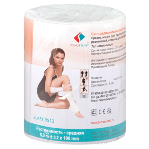 Бинт эластичный компрессионный средней растяжимости 5 м х 10 см Tonus Elast 9512 применяется для профилактики и лечения хронических венозных воспалительных процессов в до- и послеоперационный периоды, для профилактики образования гематом, вывихов, растяжений, отеков, а также для профилактики и лечения травм, связанных со спортом. Металлический фиксатор с усиленной фиксацией позволяет удерживать бинт в нужном месте.