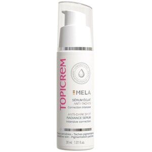 Topicrem Mela Serum Éclat Anti-Taches (Топикрем Мела Сыворотка сияние против пигментных пятен) для всех типов, в том числе чувствительной кожи.Сыворотка против темных пятен MELA Radiance корректирует пигментные пятна и предотвращает их появление, делая кожу более однородной за 7 дней. Благодаря сочетанию запатентованного комплекса MELA и нового инновационного способа воздействия на индукторы меланогенеза эта сыворотка обеспечивает интенсивную коррекцию всех типов пятен, выравнивает и возвращает сияние лицу. Её свежая, ультралегкая и жидкая текстура увлажняет кожу и оставляет цветочный, пудровый и мускусный аромат.. Подходит для области вокруг глаз. Протестировано под дерматологическим и офтальмологическим контролем на чувствительной коже от светлого до темного типа. Некомедогенный.Активные компоненты: запатентованный комплекс MELA [Ниацинамид + экстракт водорослей] выравнивает цвет лица, уменьшает все виды пигментных пятен, био-экстракт лимонника воздействует как на выработку, так и на передачу меланина, глицерин увлажняет и помогает укрепить кожный барьер.По результатам клинических исследований 98% добровольцев отметили эффективность коррекции пигментных пятен после использования сывротки в течение 57 дней. без парабенов гипоаллергенноРезультат Ровный, однородный цвет кожи. Пигментные пятна не заметны.