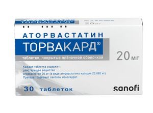 Показания к применениюВ сочетании с диетой для снижения повышенных уровней общего Хс, Хс-ЛПНП, аполипопротеина В и триглицеридов и повышения уровня Хс-ЛПВП у больных с первичной гиперхолестеринемией, гетерозиготной семейной и несемейной гиперхолестеринемией и комбинированной (смешанной) гиперлипидемией (типы IIa и IIb по Фредриксону);в сочетании с диетой для лечения больных с повышенными сывороточными уровнями триглицеридов (тип IV по Фредриксону) и больных с дисбеталипопротеинемией (тип III по Фредриксону), у которых диетотерапия не дает адекватного эффекта;для снижения уровней общего Хс и Хс-ЛПНП у больных с гомозиготной семейной гиперхолестеринемией, когда диетотерапия и другие нефармакологические методы лечения оказываются недостаточно эффективными.ПротивопоказанияСпособ применения и дозы Перед назначением Торвакарда больному необходимо рекомендовать стандартную гиполипидемическую диету, которую он должен продолжать соблюдать в течение всего периода терапии.Начальная доза составляет в среднем 10 мг 1 раз/сут. Доза варьирует от 10 до 80 мг 1 раз/сут. Препарат можно принимать в любое время дня с пищей или независимо от времени приема пищи. Дозу подбирают с учетом исходных уровней Хс-ЛПНП, цели терапии и индивидуального эффекта. В начале лечения и/или во время повышения дозы Торвакарда необходимо каждые 2-4 недели контролировать уровни липидов в плазме крови и соответствующим образом корригировать дозу.При первичной гиперхолестеринемии и смешанной гиперлипидемии в большинстве случаях бывает достаточно назначения дозы 10 мг препарата Торвакард 1 раз/сут. Существенный терапевтический эффект наблюдается через 2 недели, как правило, и максимальный терапевтический эффект обычно наблюдается уже через 4 недели. При длительном лечении этот эффект сохраняется.СоставДействующее вещество: Аторвастатин (Atorvastatin)Концентрация действующего вещества (мг): 20Взаимодействие с другими препаратамиПрепарат следует хранить в недоступном для детей месте.