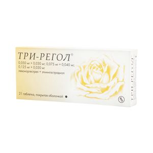 Показания к применениюПероральная контрацепция.Применение при беременности и кормлении грудьюПри беременности и в период лактации прием препарата Три-Регол противопоказан.ПротивопоказанияПовышенная чувствительность к какому-либо компоненту препарата. Беременность, период кормления грудью, тяжелые заболевания печени, опухоли печени, врожденные гипербилирубинемии (синдромы Жильбера, Дубина-Джонсона и Ротора), холелитиаз, холецистит, хронический колит; наличие или указание в анамнезе на тяжелые сердечно-сосудистые (в т.ч. декомпенсированные пороки сердца) и цереброваскулярные изменения, тромбоэмболии и предрасположенность к ним, флебит глубоких вен нижних конечностей, гормонозависимые злокачественные новообразования половых органов и молочных желез (в т.ч. подозрение на них), семейные формы гиперлипидемии, артериальная гипертензия с систолическим/диастолическим артериальным давлением 160/100 мм рт.ст. и выше, хирургические вмешательства, хирургические операции на нижних конечностях, длительная иммобилизация, обширные травмы, панкреатит (в т.ч. в анамнезе), сопровождающийся выраженной гипертриглицеридемией и гиперлипидемией, желтуха вследствие приема лекарственных средств, содержащих стероиды, тяжелые формы сахарного диабета, серповидноклеточная анемия, хроническая гемолитическая анемия, влагалищное кровотечение неизвестной этиологии, мигрень, пузырный занос, отосклероз с ухудшением течения во время предшествующей(их) беременности(тей); идиопатическая желтуха беременных, тяжелый кожный зуд беременных, герпес беременных в анамнезе; курение в возрасте старше 35 лет, возраст старше 40 лет; недостаточность лактазы, непереносимость лактозы, глюкозо-галактозная мальабсорбция (в лекарственной форме препарата содержится лактоза).СоставДействующее вещество: Таблетки I: содержат 0,03 мг этинилэстрадиола и 0,05 мг левоноргестрела, Таблетки II: содержат 0,04 мг этинилэстрадиола и 0,075 мг левоноргестрела,Концентрация действующего вещества (мг): 0,08 мг, 0,115 мг, 0,155 мг
