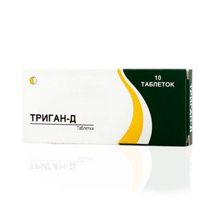 Показания к применениюСимптоматическое лечение при болях в животе: · Колики (почечные, печеночные, кишечные) . · синдром раздраженного кишечника с наличием спастического сокращения гладкомышечной оболочки кишки . · дисменорея.Применение при беременности и кормлении грудьюПротивопоказан для беременных. В случае, если препарат назначается кормящей женщине, грудное вскармливание на период приема препарата временно прекращают.Противопоказания· Обструктивные заболевания мочевыводящей системы, ЖКТ и печеночного тракта . · при острых кровотечениях в случае нестабильности состояния сердечно-сосудистой системы . · рефлюкс-эзофагит . · миастения gravis . · глаукома . · тяжелый язвенный колит . · выраженные нарушения печеночных и (или) почечных функций . · декомпенсированная сердечно-сосудистая недостаточность . · гипертрофия предстательной железы . · гиперчувствительность к парацетамолу и любому другому из компонентов Тригана-Д . · заболевания системы крови . · коллапс . · дефицит глюкозо-6-фосфатдегидрогеназы . · возраст до 12 лет.Побочное действиеСо стороны пищеварительного тракта: затруднения при глотании и разговоре, жажда, рвота, снижение подвижности и тонуса желудочно-кишечного тракта, сухость во рту, запор. Со стороны сердечно-сосудистой системы: тахикардия, аритмия, кратковременная брадикардия. Со стороны нервной системы: головокружение, пошатывание, сонливость. Со стороны глаз: повышение внутриглазного давления, фотофобия, расширение зрачков с утратой аккомодации. Другие: недержание мочи, сухость и покраснение кожи, аллергические реакции, угнетение кроветворения.СоставПарацетамол 500 мг дицикловерина гидрохлорид 20 мг