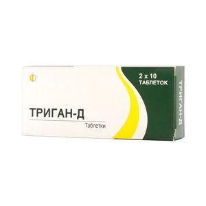 Показания к применениюСимптоматическое лечение при болях в животе:· Колики (почечные, печеночные, кишечные);· синдром раздраженного кишечника с наличием спастического сокращения гладкомышечной оболочки кишки;· дисменорея.Применение при беременности и кормлении грудьюПротивопоказан для беременных. В случае, если препарат назначается кормящей женщине, грудное вскармливание на период приема препарата временно прекращают.Противопоказания· Обструктивные заболевания мочевыводящей системы, ЖКТ и печеночного тракта;· при острых кровотечениях в случае нестабильности состояния сердечно-сосудистой системы;· рефлюкс-эзофагит;· миастения gravis;· глаукома;· тяжелый язвенный колит;· выраженные нарушения печеночных и (или) почечных функций;· декомпенсированная сердечно-сосудистая недостаточность;· гипертрофия предстательной железы;· гиперчувствительность к парацетамолу и любому другому из компонентов Тригана-Д;· заболевания системы крови;· коллапс;· дефицит глюкозо-6-фосфатдегидрогеназы;· возраст до 12 лет.Побочное действиеСо стороны пищеварительного тракта: затруднения при глотании и разговоре, жажда, рвота, снижение подвижности и тонуса желудочно-кишечного тракта, сухость во рту, запор.Со стороны сердечно-сосудистой системы: тахикардия, аритмия, кратковременная брадикардия.Со стороны нервной системы: головокружение, пошатывание, сонливость.Со стороны глаз: повышение внутриглазного давления, фотофобия, расширение зрачков с утратой аккомодации.Другие: недержание мочи, сухость и покраснение кожи, аллергические реакции, угнетение кроветворения.СоставАктивные компоненты (в 1 таблетке): парацетамол — 500 мг, гидрохлорид дицикламина — 20 мг.Неактивные компоненты: гидрофосфат кальция, тальк, крохмалгликолат, стеарат магния, сахар, желатин.Взаимодействие с другими препаратамиПотенцируют действие Тригана-Д антипсихотические средства, амантадин, ингибиторы моноаминоксигеназы, трициклические антидепрессанты, бензодиазепины, наркотические анальгетики, холинолитики, симпатомиметики, нитраты и нитриты, кортикостероиды.Снижает эффективность препарата одновременное назначение антацидов. Триган-Д потенцирует действие дигоксина.Гепатотоксичность Тригана-Д усиливается при приеме с барбитуратами, рифампицином, алкоголем и зидовудином.