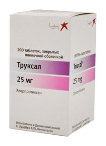 Показания к применениюТруксал является седативным нейролептиком с широким спектром показаний, в которые входят:психозы, включая шизофрению и маниакальные состояния, протекающие с психомоторным возбуждением, ажитацией и тревогой, похмельный абстинентный синдром при алкоголизме и наркоманиях, гиперактивность, раздражительность, возбуждение, спутанность сознания у пожилых пациентов, нарушения поведения у детей, депрессивные состояния, неврозы, психосоматические расстройства, бессонница, боли (в комбинации с анальгетиками).Применение при беременности и кормлении грудьюВо время беременности Труксал следует применять, польза для матери превышает потенциальный риск для плода. Данных о применении хлорпротиксена у беременных женщин нет. У новорожденных, чьи матери принимали антипсихотичес сроках беременности или во время родов, могут наблюдаться интоксикации, такие как летаргия, тремор и чрезмерная возбудимость. Кроме того, у таких новорожденных отмечается низкий балл по шкале Апгар. У новорожденных, чьи матери принимали антипсихотические средства (в т.ч. хлорпротиксен) во время третьего триместра беременности могут наблюдаться признаки побочных эффектов, включая экстрапирамидные симптомы и/или синдром «отмены», которые после рождения могут варьироваться по тяжести и продолжительности. Сообщалось о следующих побочных эффектах: ажитация, гипертония, гипотония, тремор, сонливость, угнетение дыхания и трудности с кормлением. Таким образом, за новорожденными должно вестись тщательное наблюдение. Во время кормления грудью лечения Труксал может применяться только если это признано клинически необходимым. В этом случае рекомендуется наблюдать за состоянием новорожденного, особенно в первые 4 недели после рождения. Хлорпротиксен выделяется с грудным молоком в таких небольших концентрациях, что не может оказывать терапевтическое воздействие на новорожденных. Доза, усваиваемая ребенком, составляет около 2% дозы, принимаемой матерью. Исследования на животных не свидетельствуют об увеличении побочных эффектов у плода или о каком-либо другом отрицательном воздействии на репродуктивный процесс.ПротивопоказанияУгнетение ЦНС любого происхождения (в том числе вызванное приемом алкоголя, барбитуратов или опиатов), коматозные состояния, сосудистый коллапс, заболевания органов кроветворения, феохромоцитома.Повышенная чувствительность к компонентам препарата.Труксал не должен, по возможности, назначаться беременным женщинам и в период грудного вскармливания.Состав1 таблетка покрытая оболочкой, содержит: активное вещество: хлорпротиксена гидрохлорид 25 мг, вспомогательные вещества: крахмал кукурузный, лактозы моногидрат, коповидон, глицерол 85%, целлюлоза микрокристаллическая, натрия кроскармеллоза, тальк, магния стеарат, состав пленочной оболочки: Opadry OY-S-9478 коричневый (E 172,E 171) RM 1030