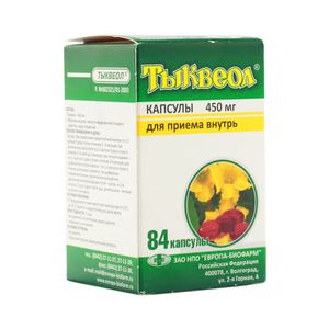 Показания к применениюДля приема внутрь: — цирроз печени; — хронический гепатит; — жировая дегенерация печени; — инфекционный гепатит; — токсические поражения печени (лекарственными средствами, промышленными ядами, алкоголем); — холецистит (некалькулезный); — холестаз; — дискинезия желчевыводящих путей; — гастрит; — колит, энтероколит (неинфекционного генеза); — геморрой; — атеросклероз; — простатит; — доброкачественная гиперплазия предстательной железы.; Для ректального применения: — хронический простатит; — доброкачественная гиперплазия предстательной железы I-II стадии с сопутствующим простатитом.; Для наружного и местного применения: — герпес; — дерматит; — псориаз; — экзема; — ожоги и ожоговая болезнь; — эрозия шейки матки; — кольпит, эндоцервицит; — заболевания пародонта.Применение при беременности и кормлении грудьюКлинические данные об эффективности и безопасности применения Тыквеола при беременности и в период лактации отсутствуют.Противопоказания— повышенная чувствительность к компонентам препарата.Побочное действиеСо стороны пищеварительной системы: редко — диспепсия, диарея.; Прочие: аллергические реакции.Состав1 капсула содержит: масло семян тыквы 450 мг.Взаимодействие с другими препаратамиКлинически значимого взаимодействия Тыквеола с другими лекарственными препаратами не установлено.