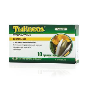 Показания к применениюДоброкачественная гиперплазия предстательной железы (профилактика и лечение 1-й и 2-й стадии аденомы), хронический простатит, сексуальные расстройства при простатите, геморрой, трещины и экзема анальной области, перианит, до- и после операционное лечение в проктологии.Применение при беременности и кормлении грудьюКлинические данные об эффективности и безопасности применения Тыквеола при беременности и в период лактации отсутствуют.ПротивопоказанияГиперчувствительность.Побочное действиеДиспепсия, диарея (требуется снижение доз).Состав1 суппозиторий содержит:Активное вещество: масло семян тыквы 500 мгВспомогательные вещества: масло какао.Взаимодействие с другими препаратамиКлинически значимого взаимодействия Тыквеола с другими лекарственными препаратами не установлено.
